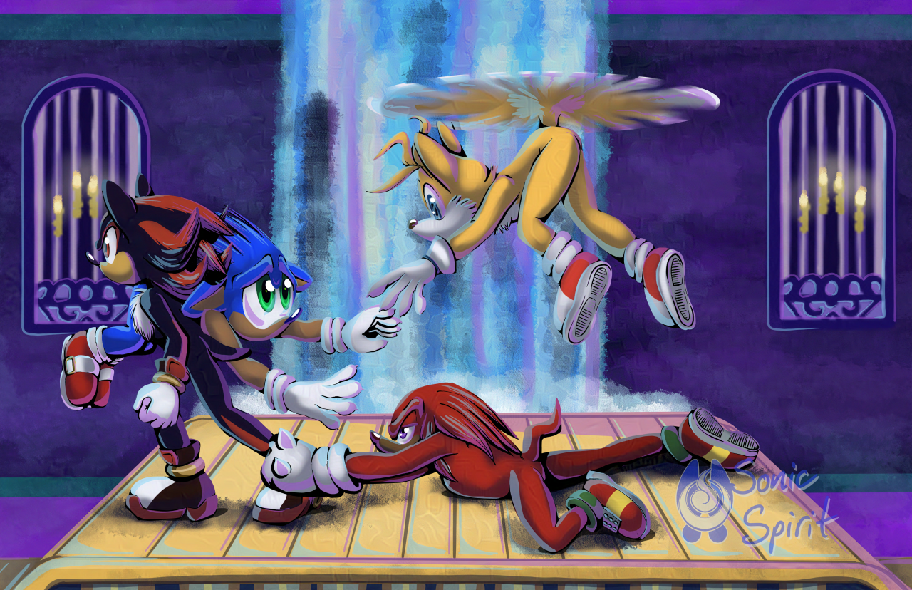 I, eh...ended up forgetting to add the "battle damage" to Sonic, but that's the story I have in my head. Shads hauling Sonic away to doctor him while Tails and Knux halfheartedly protest. ^_^ Because it's cute. Honestly, there BEING no obvious battle damage on Sonic probably sells the idea better than if I had put some blood and scuffs up ins.