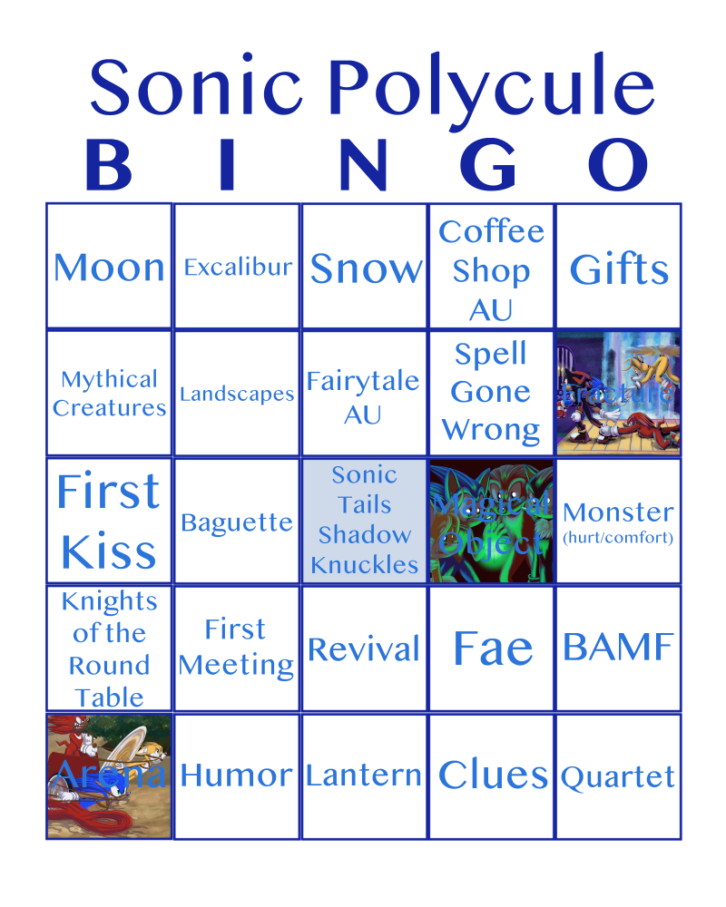 So...! Let's try and do this! I've been wanting to do more stuff of Me, Tails, Knuckles, and Shadow as a polycule for awhile now! I put together a fun little BINGO card inspired by this one (a Merlin/Arthur bingo challenge) I found on Tumblr. So, let's see how far I get with this! Currently my scheme is to try and complete the whole BINGO blackout in 2026, so we'll see!