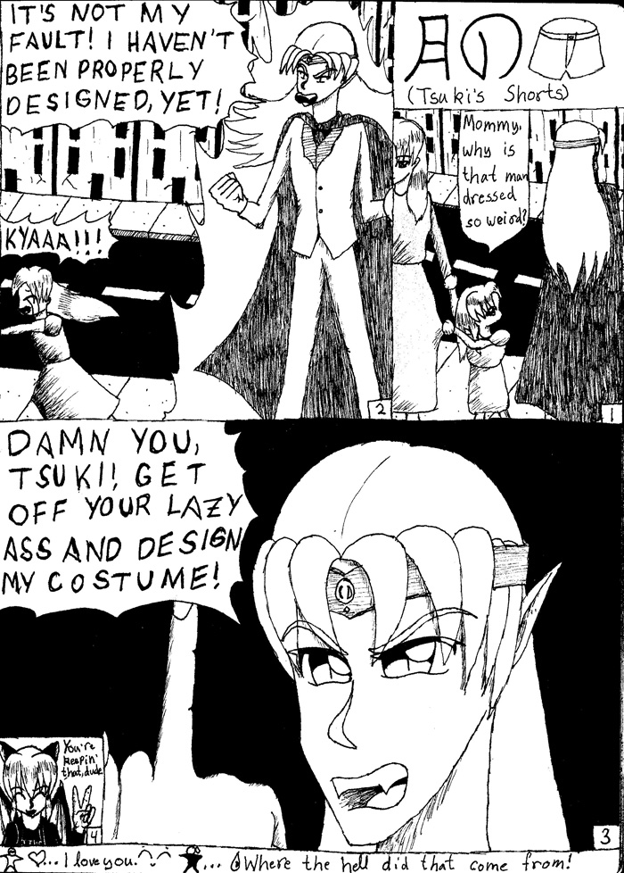 WOW, are you out of character, Kaze! Seriously, that guy's supposed to be cool and calm, with maybe a slight stick up his ass. Of course, he's also supposed to be super fancy, and the best I had come up with at the time was a pretty white suit and a cape. And a crown/tiara/thing. So, you know.